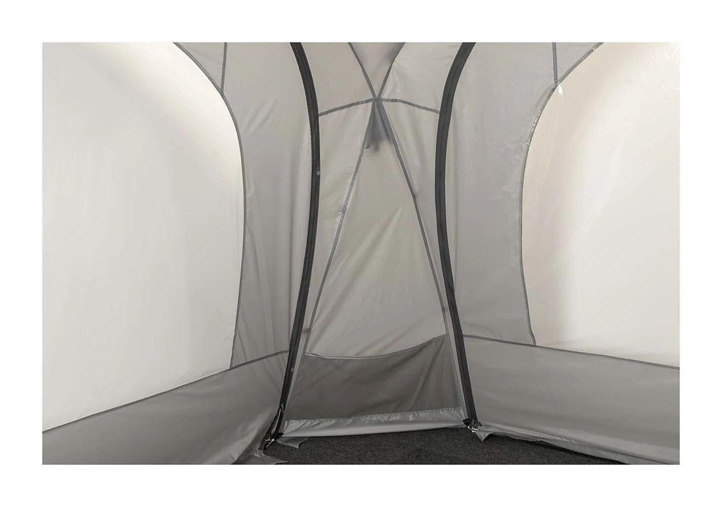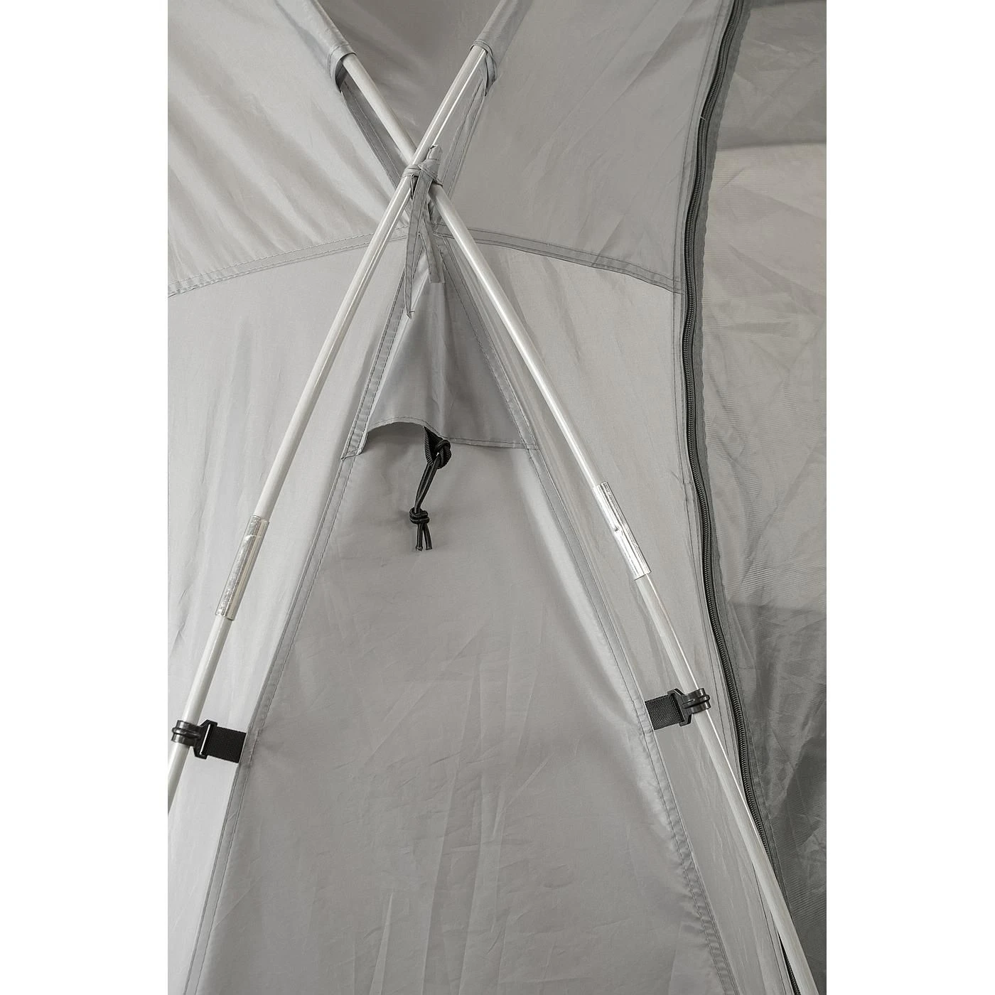 Een ruime partytent. Uitermate geschikt voor activiteiten en evenementen buitenshuis. Het tentdoek is gemaakt van 190T polyester en is waterdicht (waterkolom 1200 mm). De partytent heeft een muskieten werende mesh zijwand en 3 zijwanden voorzien van een PVC raam. De zijwanden zijn te openen en sluiten met een rits, niet afneembaar en op te bergen in een vak in de tent. De kruisende boogstokken zorgen voor extra stevigheid en stabiliteit. Wordt geleverd met scheerlijnen, haringen en draagtas.